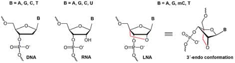 Locked Nucleic Acids (LNA) are a class of synthetic nucleic acid analogues that contain a “locked” bicyclic sugar moiety. This linkage between the 2’-O- and the 4’-C-position locks the ribose in the 3´-endo conformation (see Figure 1) which leads to the characteristic structure of A-form RNA and forms exclusively A-type duplexes.